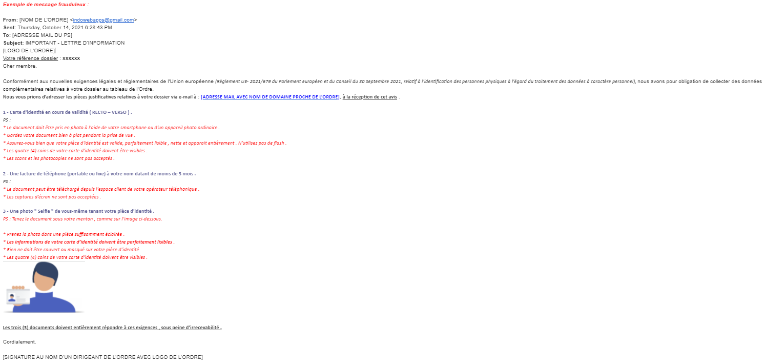 Dans tous les cas, posez-vous la question de la légitimité de la demande exprimée dans le courriel ou sms reçu. Ainsi, les pièces demandées dans l'exemple ci-dessus ne sont pas demandées par email par l’Ordre. En cas de doute, appelez directement votre conseil d’appartenance à l’Ordre.